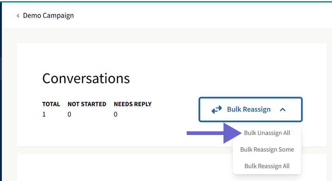 From this page, you can see how many conversations each sender has and how many are unassigned. You can easily unassign all the conversations by opening the Bulk Reassign dropdown and then clicking Bulk Unassign All.