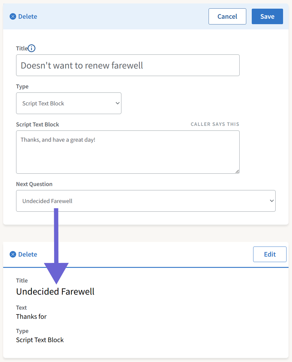 - Script Text Block: Displays text for callers to read to their contacts. There are no responses to this question type, so this shouldn't be used to ask questions. These are commonly used for ending cards to say goodbye to contacts.