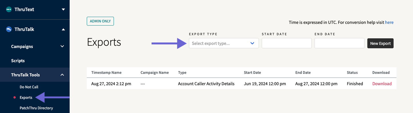 ThruTalk Exports can be accessed by clicking on Export in the ThruTalk Tools navigation menu.