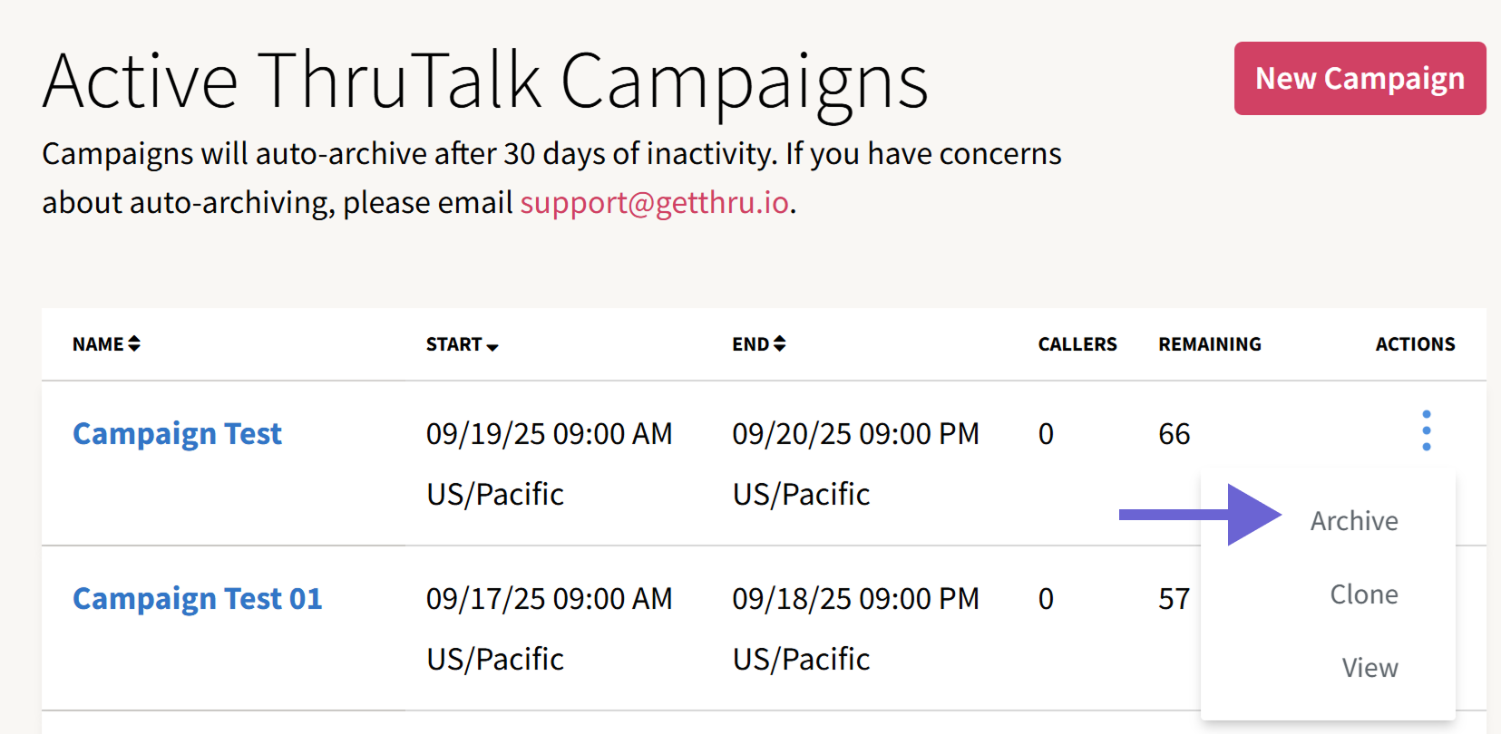 Auto Archiving is a system feature that automatically deactivates campaigns after 30 days of inactivity. To avoid auto-archiving for a ThruTalk campaign, log in and make a call and the 30 day timer will restart.`
