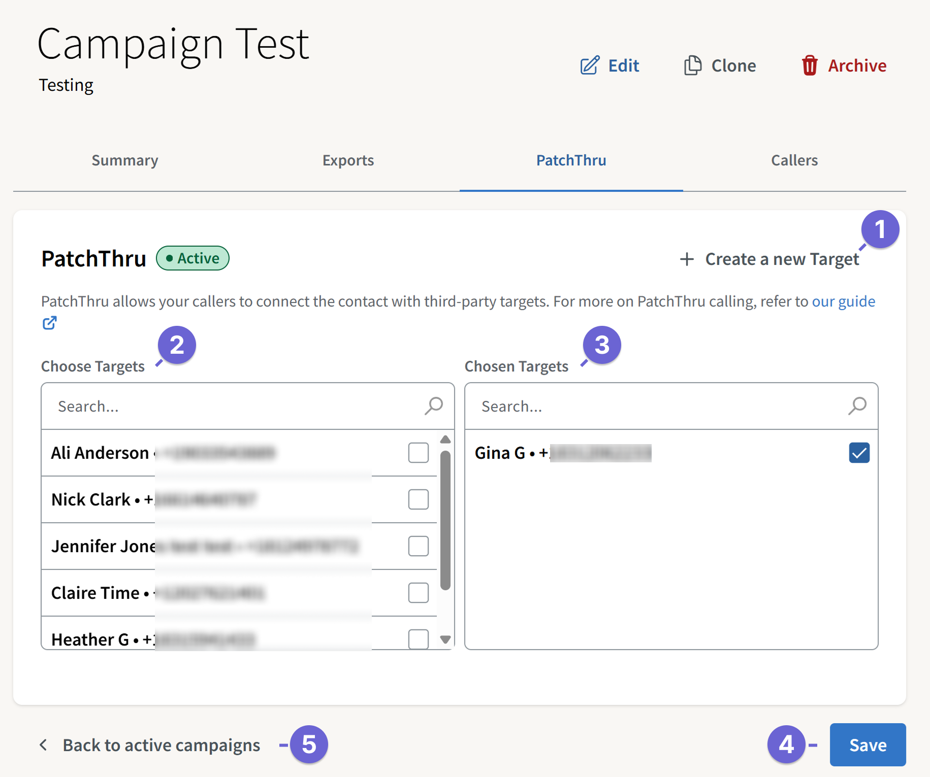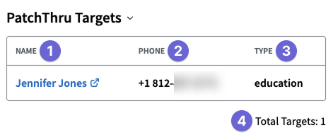 You’ll only see this section if PatchThru targets were added to the campaign either prior to launch or after launch via the campaign's PatchThru tab. Review the guide Launching a ThruTalk Campaign and the section Add PatchThru Targets for details.
