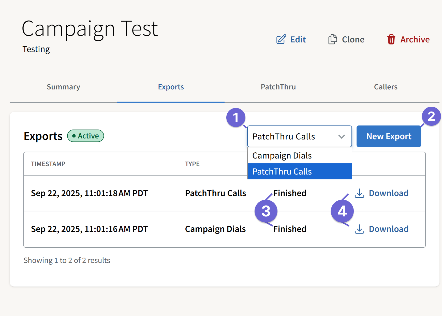 The Exports tab is where you can generate an export of all campaign dials or PatchThrus completed within the campaign. Exporting is available on active and archived calling campaigns.