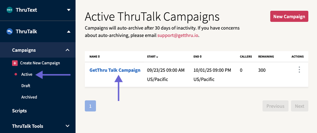 - Archive: Archive the campaign. Archiving a campaign is the final step of administering a calling campaign. Once a campaign has been archived, users will no longer be able to continue receiving calls or access it; changes cannot be undone. Need more detail? See How to Archive a ThruTalk Campaign.