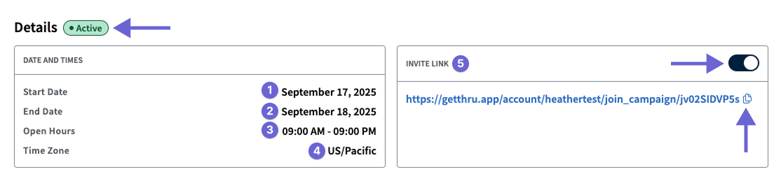 Use Campaign Details to confirm start/end dates, dialing hours, and the invite link so you know when calling is allowed and how callers can join.