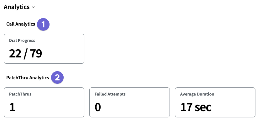 The Campaign Analytics section displays the campaign's dials and PatchThru progress. These statistics will update as calls are completed, and you will view the most current details when you open the page or refresh the browser.