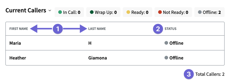 - Calling Status: The real-time calling status of in call, wrap up, ready, not ready, and offline. For definitions, review Caller Activity Statuses.