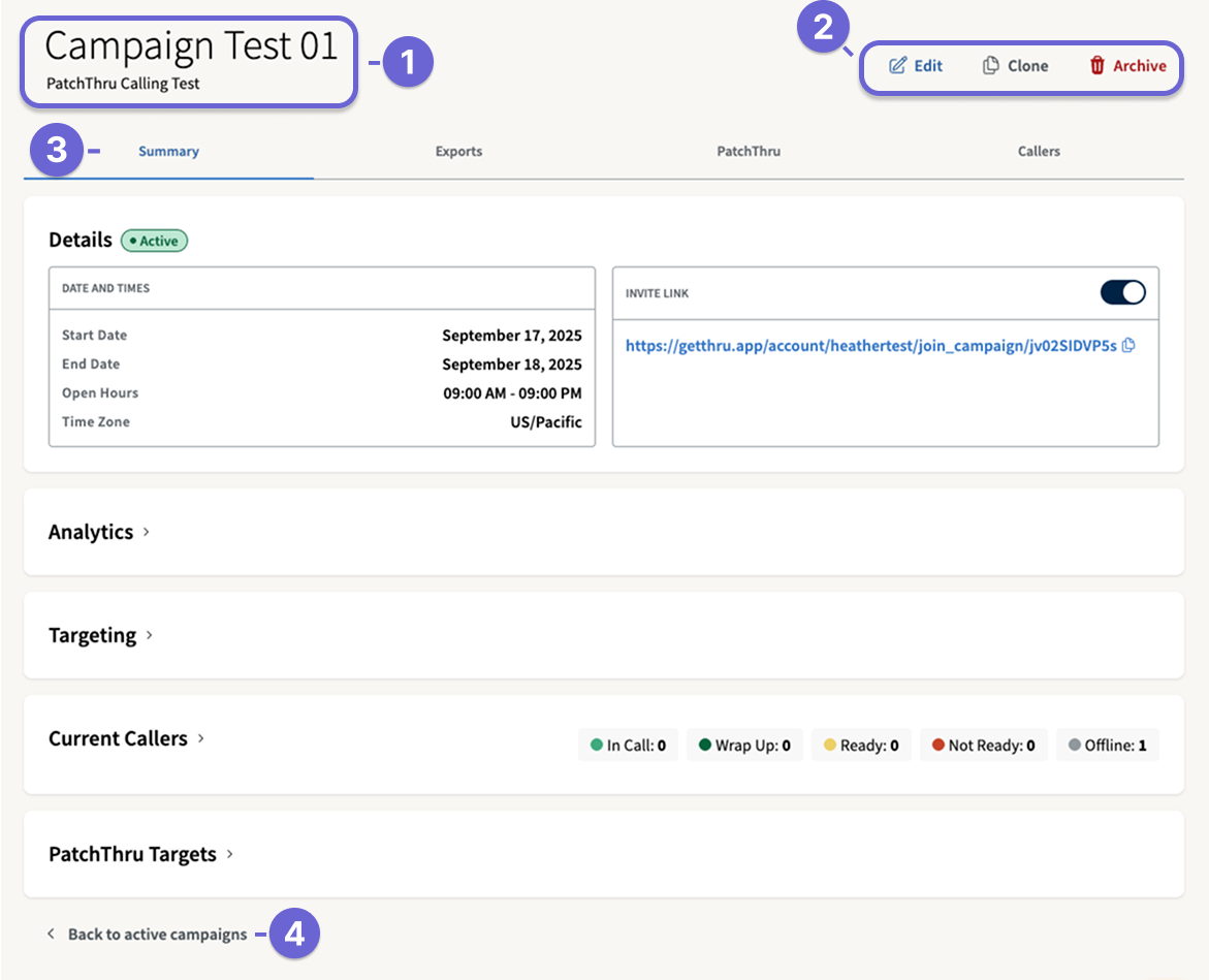 - Campaign Tabs: The Campaign Details page includes four tabs. Summary is the default tab, shown in the screenshot below with its five sections. The additional tabs, Exports, PatchThru, and Callers, are detailed below.