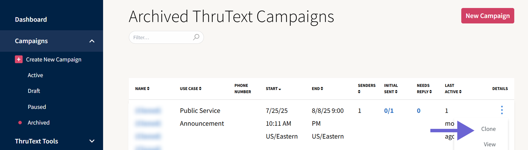 We added Draft Campaign Cloning. You can now clone a ThruText or ThruTalk draft campaign from the Campaign Index page or the review page.