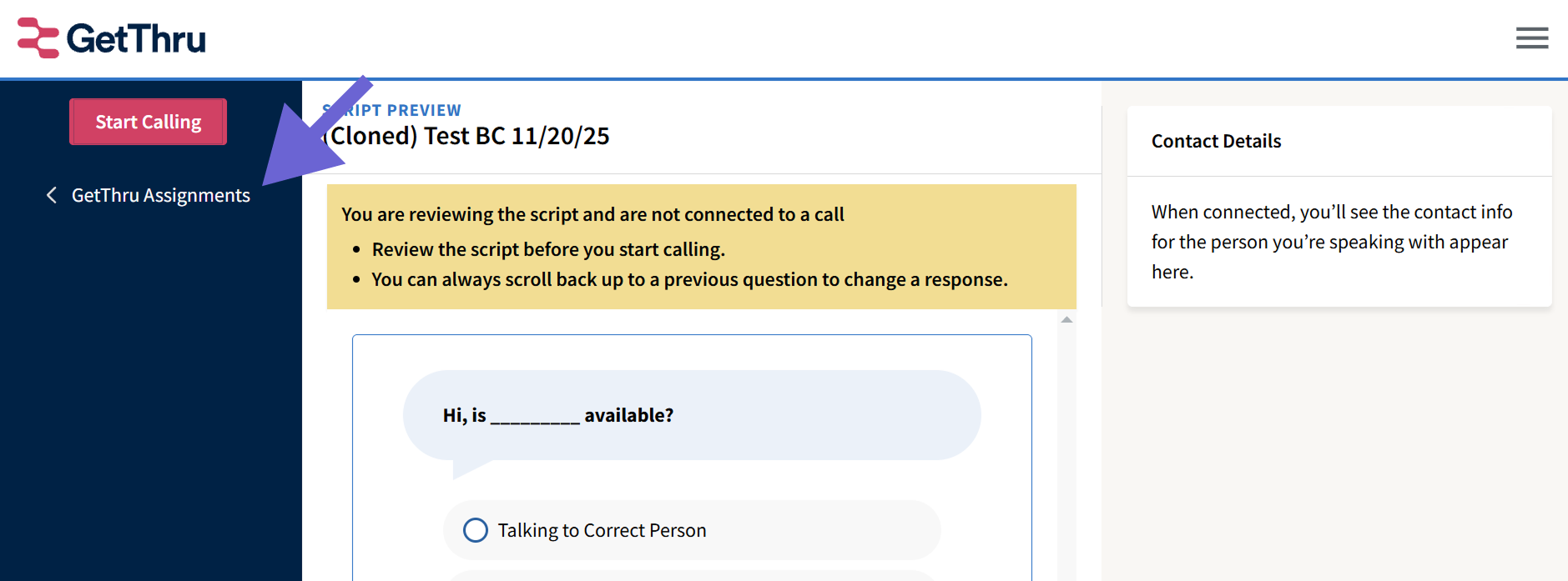 We added a button to take you back to the calling assignments page from the Caller Script Preview.